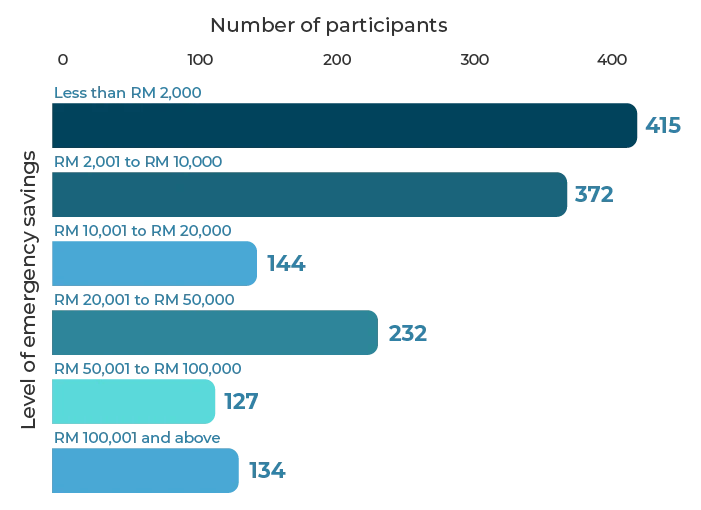 The majority of respondents (55%) have less than RM10,000 in available savings to draw on in the event of an emergency. This suggests that many Malaysians may not be adequately equipped to withstand financial shocks. We also found that those with irregular income had little emergency savings.