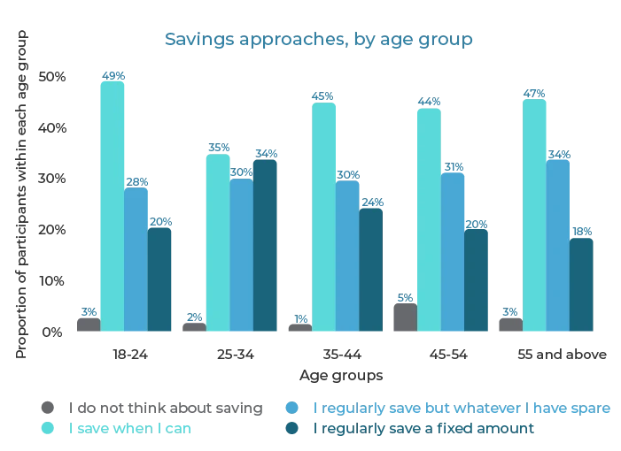 We observed a high overlap between low-income and irregular income earners, in terms of who falls into these categories, and their reported and revealed savings behaviours. They lack savings, and confidence, which may discourage financial planning. Devise more products that are designed for and appeal to these groups, such as prize-linked savings accounts; and write policy and regulation to protect them from extractive practices like payday lending which prey on a lack of attention.