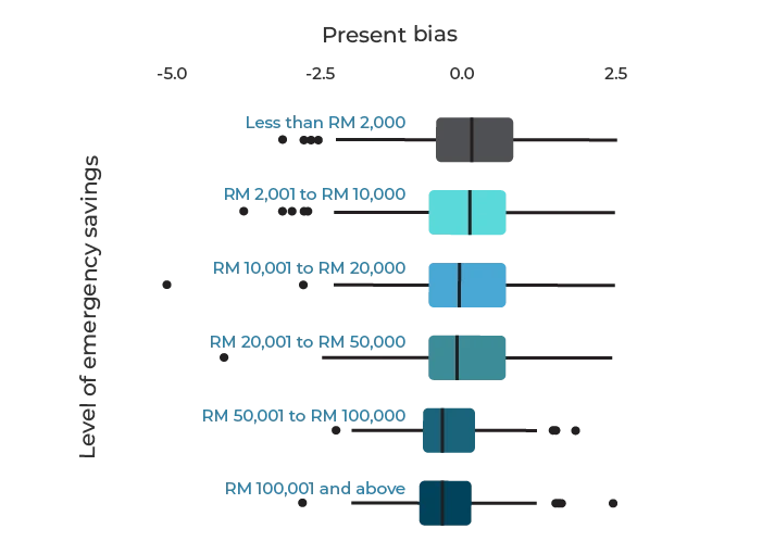 Lower income persons seem to have higher levels of present bias - especially those with the very least income. Present bias can influence us away from saving in favour of immediate needs. It is a significant behavioural obstacle to Malaysians savings. Education and intention may not be enough if ours brain are wired to direct us to the present. Products, services and policies should help us to visualise the future, commit to that future, and provide incentives now to encourage us to save for tomorrow.