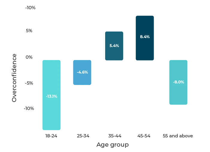 When it comes to overconfidence, we see clear differences based on age group, with those aged 45-54 years old registering the highest levels.